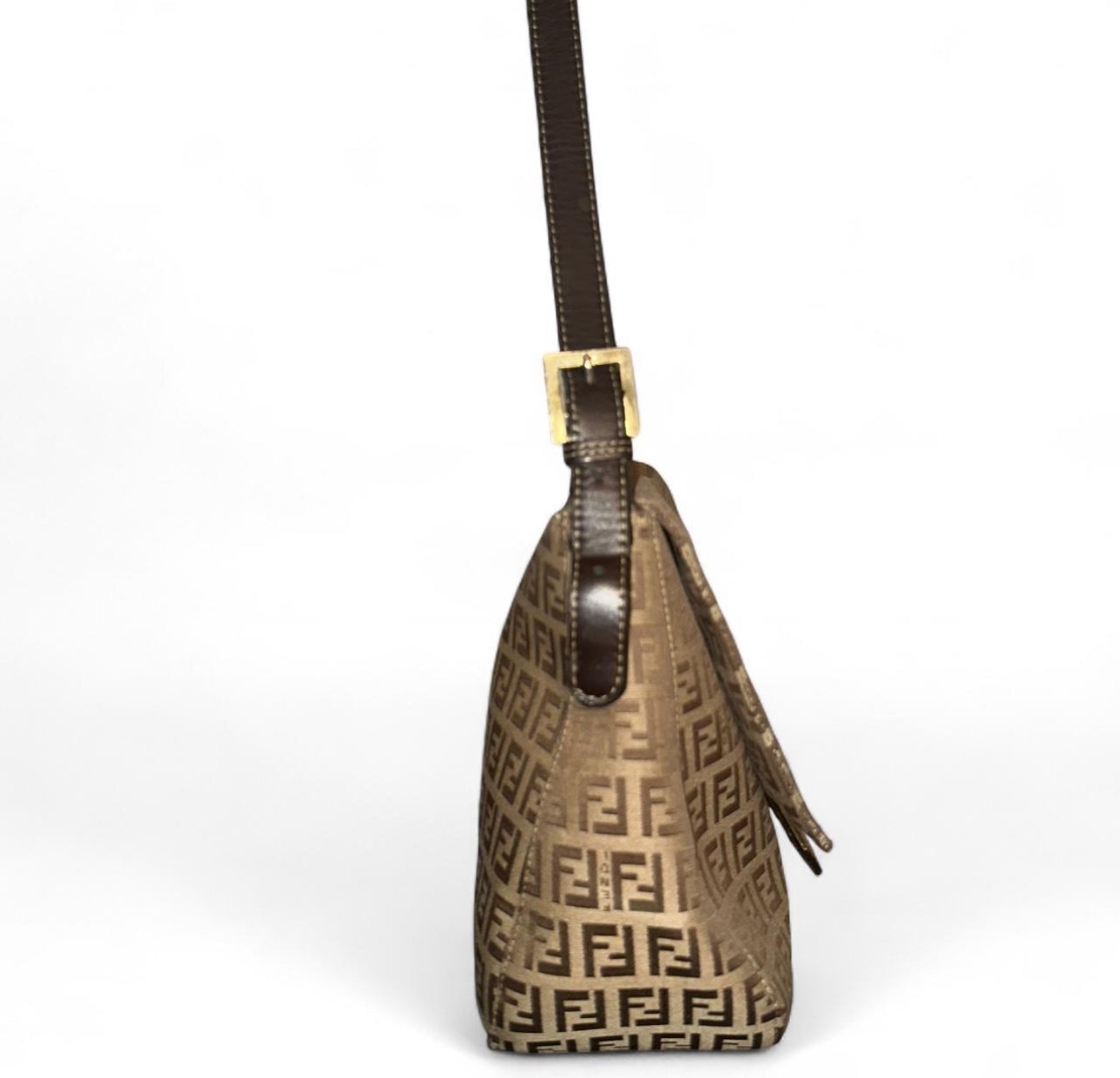 This beautiful Fendi Mamma Baguette features the iconic Zucchino canvas in beige with silver hardware. The bag is in great condition overall with no stains or major flaws. The shoulder straps show some light cracking along the edges, which does not affect use or structure.